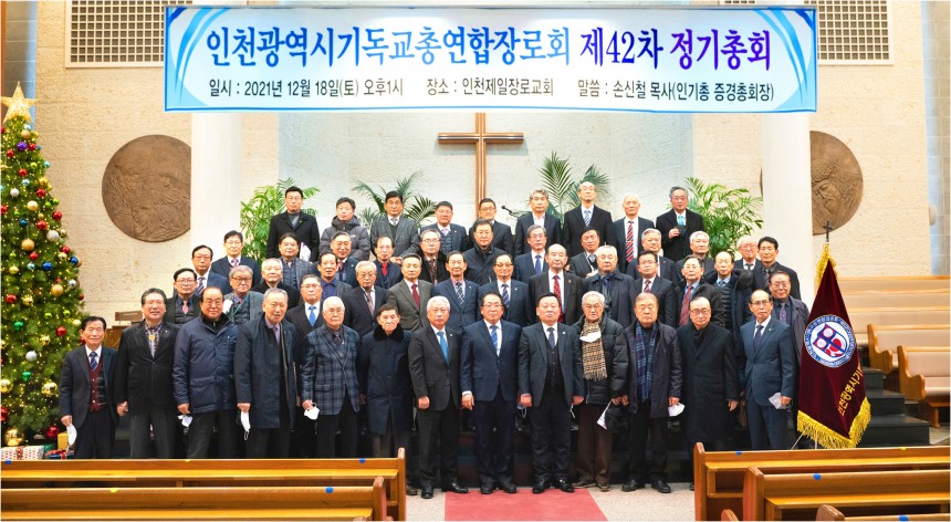 인천광역시기독교총연합장로회 42차 정기총회를 2021년 12월 18일(토) 13:00에 인천광역시 중구 송학동에 위치한 인천제일교회(손신철 목사)에서 증경 인기총 총회장 손신철 목사님을 모시고 1부 예배 후에 제42회 총회장 정세국 장로(인천제일교회)님의 취임식 등 아래와 같이 개최하였습니다.